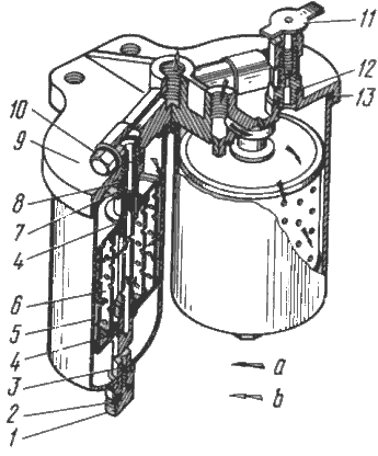 Для удаления осадка из стаканов 5 () фильтра закрыть проходной кран 17 () топливного бака, вывернуть пробки 1 (см. рис. 12), ввернутые в центральные стяжные стержни 3 и отвернуть продувочный вентиль 11, находящийся на сливной трубке. Отстой сливать до появления чистого топлива.