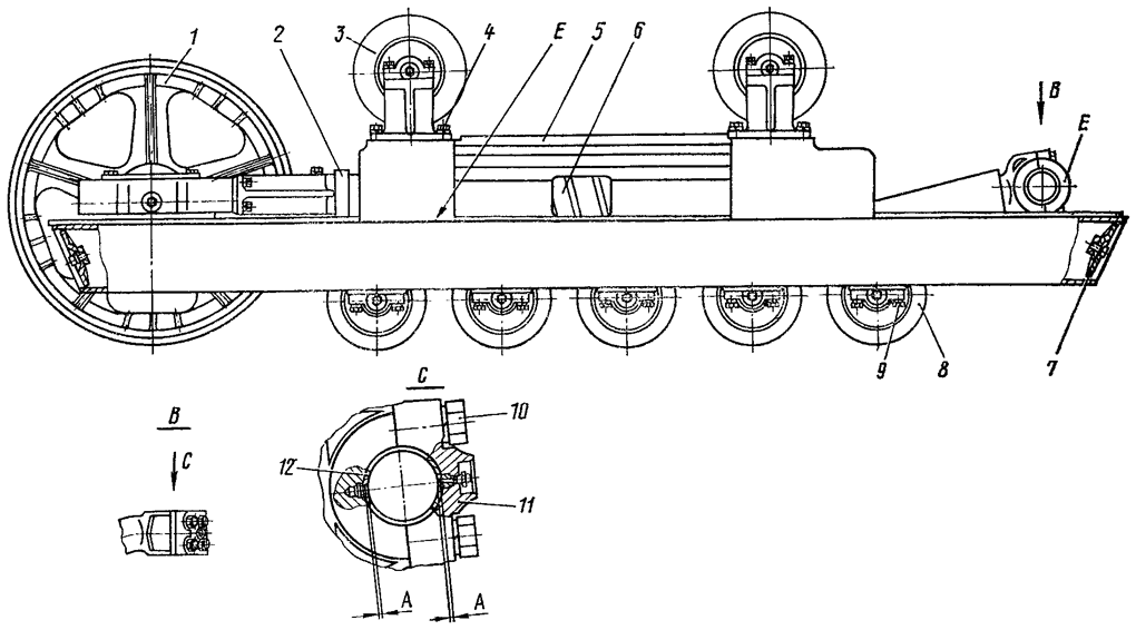 Переверните раму тележки опорными катками вверх. Отверните шесть болтов крепления защитных щитков. Сверните гайки с распорок и снимите щитки. Выньте из прямоугольных труб рамы тележки-планки крепления щитков, расположенных по концам рамы. Отверните четыре болта 9 крепления первого опорного катка 8.