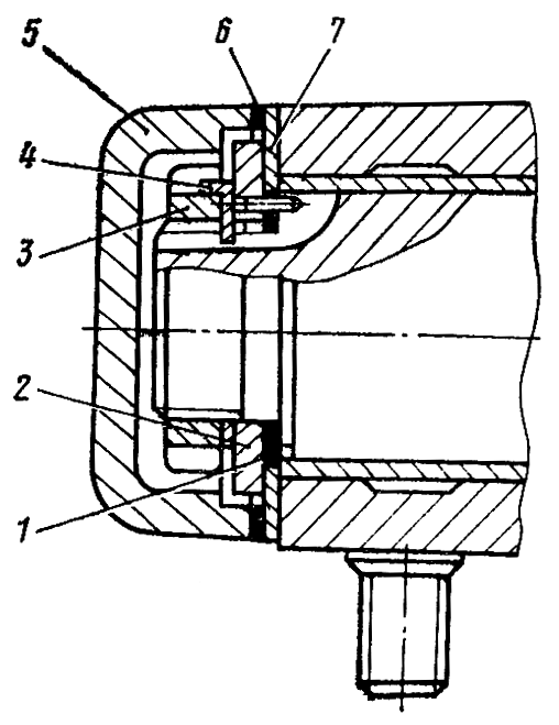 При зазоре между внутренним торцом обода ведущего колеса, и торцом беговой дорожки менее 4 мм снимите крышку концевого подшипника, расстопорите и отверните е полуоси гайку. Снимите с полуоси упорную шайбу и убавьте необходимое количество прокладок. 1. Если после этого зазор остается менее 4 мм, установите между крышкой 5 и корпусом концевого подшипника одну или две прокладки 7. При этом с каждой стороны металлической прокладки ставьте картонные прокладки 6.Установите в торцы прямоугольных труб рамы тележки заглушки и закрепите их болтами с пружинными шайбами. Установите на концевой подшипник щиток и закрепите его шестью болтами с пружинными шайбами. Поднимите домкратами трактор, уберите опоры из-под рессоры и корпуса бортовых фрикционов и опустите трактор. Соедините и натяните гусеницу.