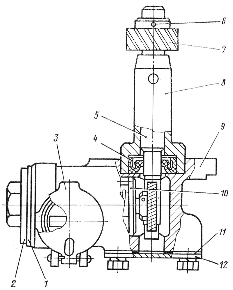 Отверните оба болта и снимите фланец 12 с прокладкой 11. Выпрессуйтё через отверстие в корпусе работомера корпус подшипника 8 при помощи оправки, манжету 4 из корпуса подшипника.