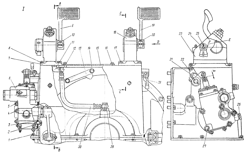 Отсоедините пружину 35 от винта 36 и выньте винт из отверстия кожуха. Отогните концы шплинта 38 и выньте его из пальца 37. Разъедините рычаг с вилкой 49, выньте палец 37. Отверните четыре болта с шайбами 8 и снимите колонку 7 в сборе с рычагом, вилкой, упором, рукавом и педалью. Ослабьте болт 50 и снимите с оси рычаг 53, выньте шпонку 52, выньте ось 51 в сборе с рычагами из отверстия кожуха. Расконтрите штуцер 12 и отсоедините рукав 30 от колена 11, выверните колено. Ослабьте болт 10, снимите педаль 9 и выньте шпонку. Отверните гайку 42 и выверните упор 43. Ослабьте гайку 39, выбейте ось 41. Выньте шплинт 45, разъедините рычаг 44 с тягой 47. Выньте шплинт 25 и снимите фиксатор 24. Ослабьте болт 34 и снимите с вала сервомеханизма рычаг 32 с тягой, выньте шпонку 33. Отверните четыре гайки 4, болт 27 и снимите сервомеханизм 6.