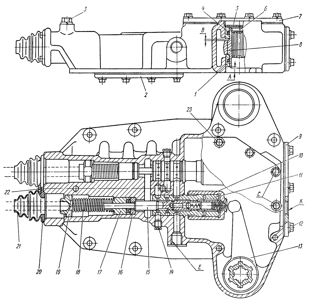 Отверните два болта 22, снимите переднюю крышку 20 вместе с уплотнительными чехлами 21. Подожмите толкатели 19, отверните стопорные винты 3 и выньте толкатели и пружины 18 из отверстий корпуса сервомеханизма.