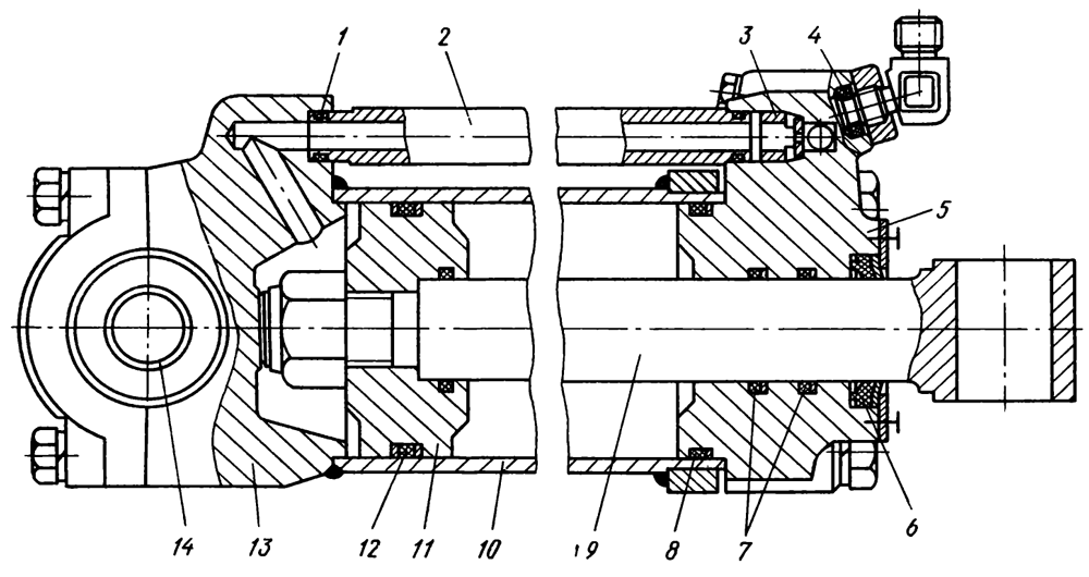 Силовые гидроцилиндры двустороннего действия (рис. 112) шарнирно связаны с нижней осью механизма навески, а их штоки соединены с подъемными рычагами. К гильзе 10 гидроцилиндра приварена нижняя крышка 13, а верхняя 5 присоединена к фланцу гильзы болтами. В отверстие верхней крышки входит шток 9, на котором закреплен поршень 11. Уплотнение штока в крышке и поршня в гильзе осуществляется резиновыми кольцами круглого сечения с защитными шайбами. Чтобы пыль и грязь не проникали в уплотнения штока, в расточку верхней крышки установлен резиновый воротник-чистик 6.
