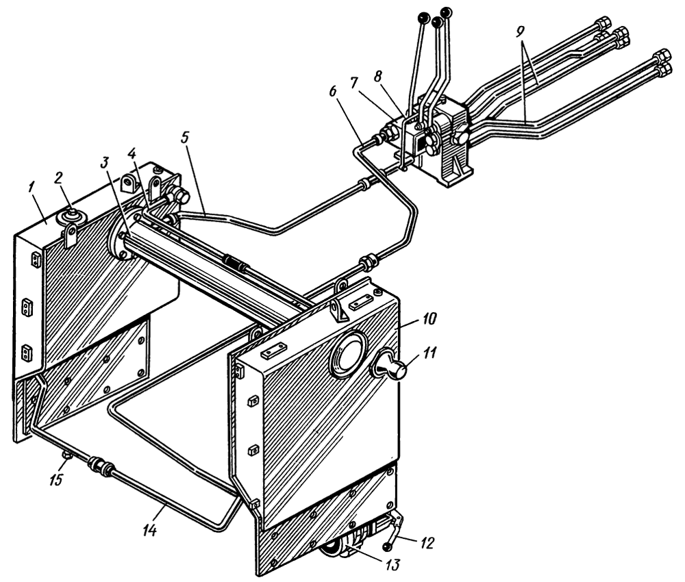 Вращая трубу рукояткой 10, можно регулировать длину верхней тяги. В тяге находится срезывающийся штифт, предохраняющий узлы трактора, механизм навески и орудия от перегрузок. При нагрузках, превышающих допустимую величину, штифт срезается и тяга укорачивается. Для восстановления длины тяги вставляют новый штифт, удалив из радиальных отверстий трубы два фланца 7, в которые входят шейки штифта. Чтобы отрезанные концы штифта не выбрасывались, отверстия во фланцах закрыты планками.